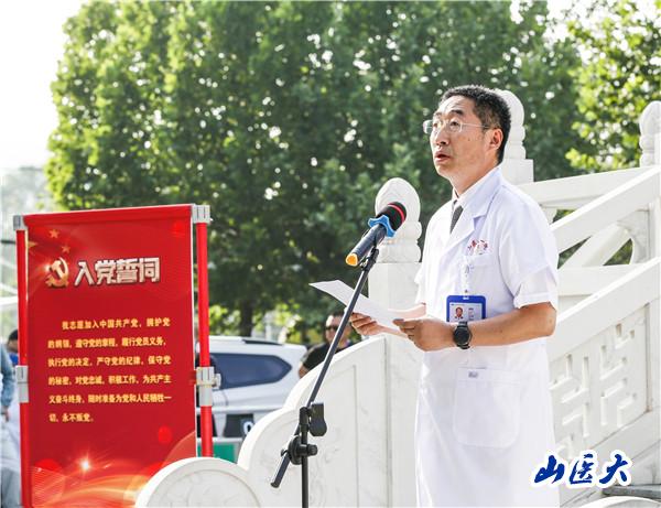 仪式在庄严的《国际歌》中拉开帷幕,院党委副书记、院长张瑞平致开幕词,对各位新党员表示祝贺,对在医院发展改革中作出卓越贡献的每一位党员表示衷心感谢。院党委书记徐钧带领新老党员面对鲜红的党旗庄严宣誓,共同表达了忠诚于党的坚定决心。